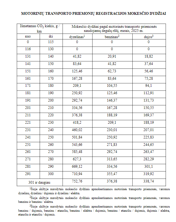 Mokesčio dydžiai, lyginant su praeitų metų dydžiais, kis nuo 0,38 Eur iki 15,12 Eur. Tikslus dydis priklausys nuo automobilio išmetamo CO2 kiekio ir degalų rūšies. Pavyzdžiui, jei benzinu varomo automobilio išmetamas CO2 yra 141 g/km, pernai jo registracijos mokesčio dydis siekė 40,98 Eur, o šiemet – 41,82 Eur. Taigi, pokytis nuo praėjusių metų – 0,84 Eur.