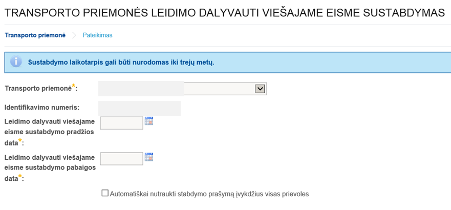 2 žingsnis: nurodyti leidimo dalyvauti viešajame eisme sustabdymo pradžios ir pabaigos datą; pažymėti „varnele“, jei pageidaujate, kad įvykdžius visas prievoles (apdraudus privalomuoju draudimu ir (ar) pasirūpinus privalomąja technine apžiūra) sustabdymo prašymas būtų automatiškai nutrauktas. Automatiniu būdu registracija bus atstatyta tuo atveju, jei nepasikeitęs transporto priemonės valdytojas ar kiti jos duomenys. Jei transporto priemonę jau įsigijo kitas asmuo ar pasikeitė ir daugiau registracijos duomenų, tuomet dėl registracijos atstatymo reikės kreiptis į „Regitros“ padalinį.