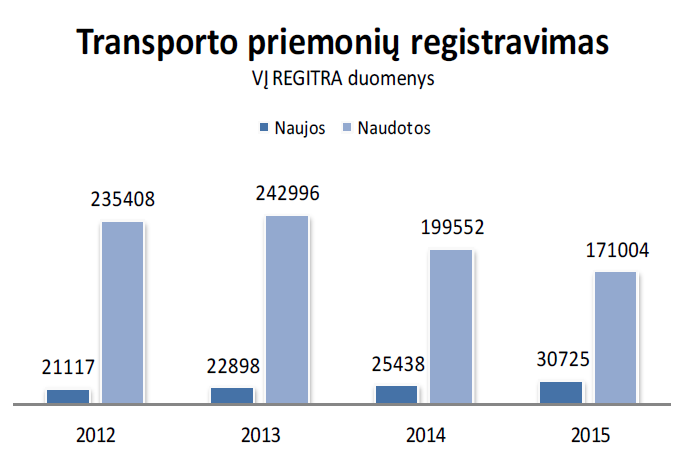 Pernai Registrą taip pat papildė 171 004 naudotų transporto priemonių duomenys. Šių transporto priemonių pernai įregistruota 14,3 proc. mažiau, nei 2014 m. (199 552).